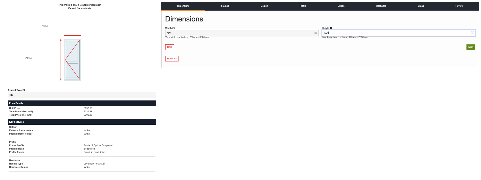 Enter your measurements in the dimension boxes. Please note the restrictions on measurements for no-frame and frame plus the height of the door too, as some door openings will require an additional top-light. Once you have added the measurements - click the green NEXT button.