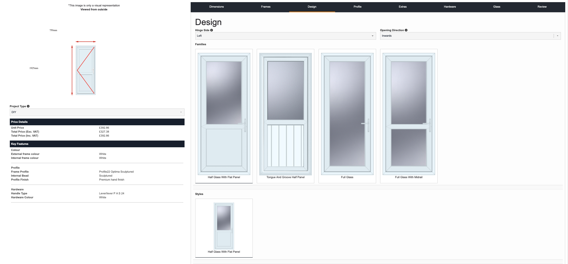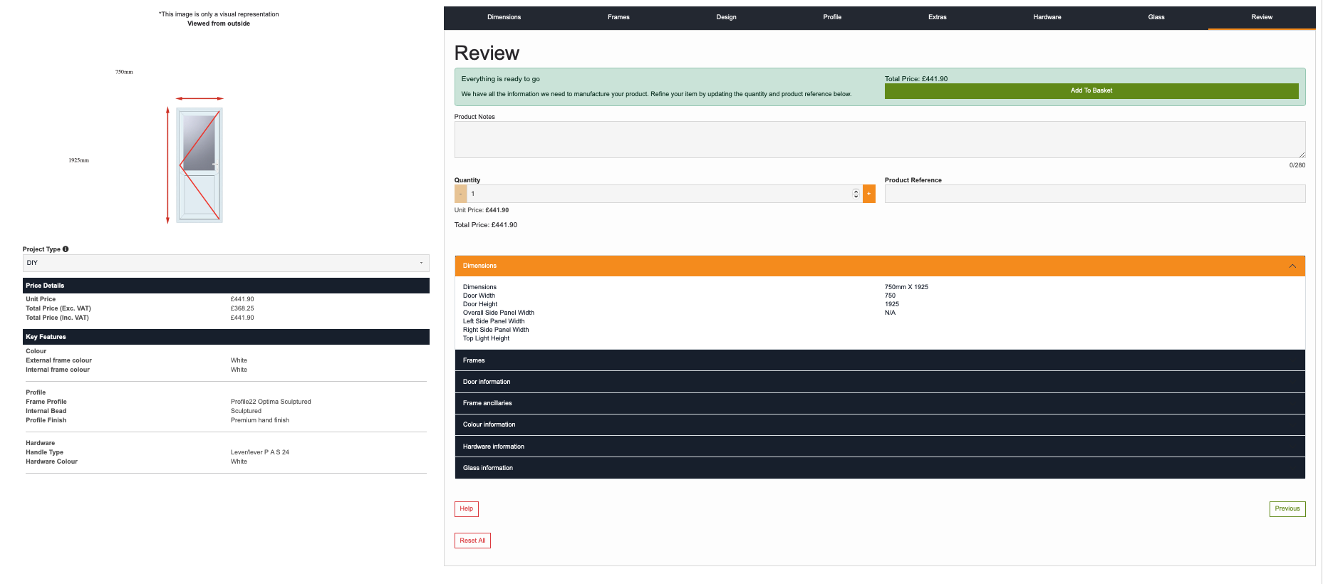The final stage is the review section - here you will run through the final design and specification before you add the door to your basket before purchasing. If you need to change anything, now is the stage to do it. You can use the tabs across the top to get back to the relevant section, once you have made the changes it then updates the review section. If everything is correct click the add to basket, then either start the design of another door, or go to the checkout to purchase the door you have just designed.