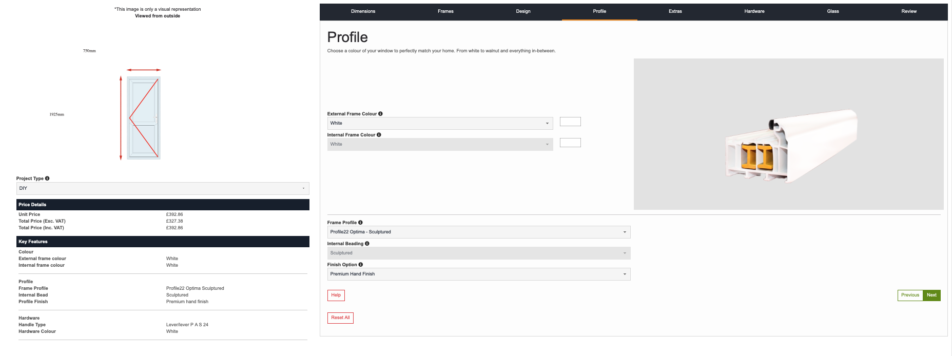 In the Profile selection you can now select the colour of your doors to perfectly match your home. We carry an extensive range of colours and can also bespoke match a specific colour too. You will need to select the external and internal colours. You will also need to choose the profile shape - either sculptured or chamfered. The image will change so you can see what you have selected. Once you have finished, then click the Green Next button.