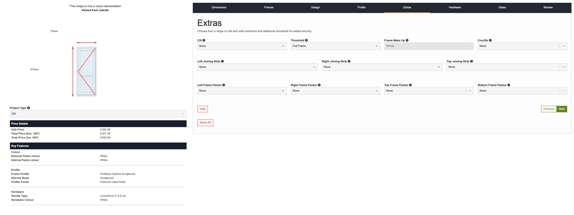 Within the Extras section you will be able to see and add any optional extras available for your doors. By selecting the small blue info button you can get additional information about what each of these options are and do. Once you have finished, then click the Green Next button.