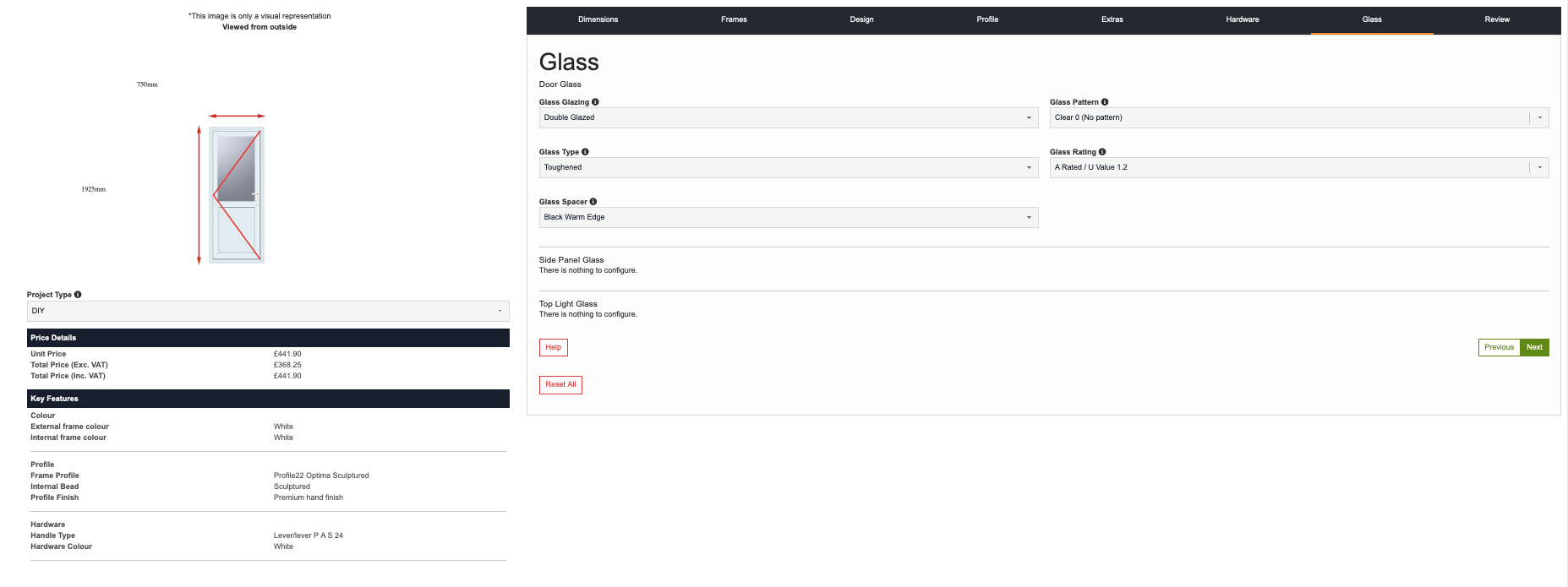 Finalise your door with glass chosen from our complete range. Our glass comes in a variety of styles including clear, satin and stippolyte etc. You will also have to select any top light and side panel glazing if required. Once you have finished your selection, then click the green Next button.