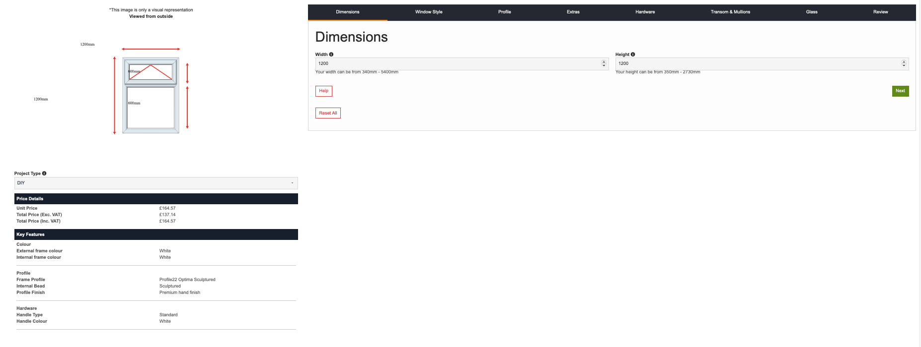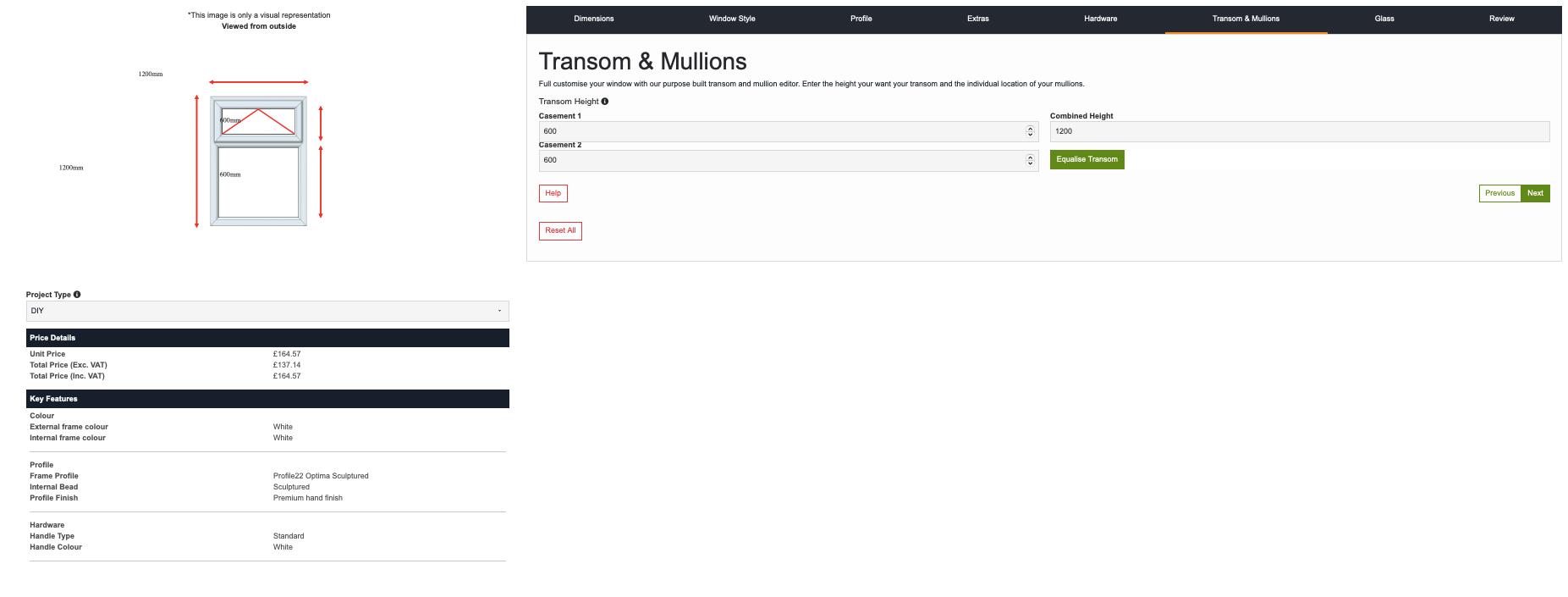 Within the Finite Design section you can fully customise your window with our purpose built transom and mullion editor. (Transom is the horizontal bar / Mullion is the vertical bar) Enter the drop your want your transom and the individual location of your mullions. We centralise the mullion bar as standard. Once you have finished, then click the Green Next button.