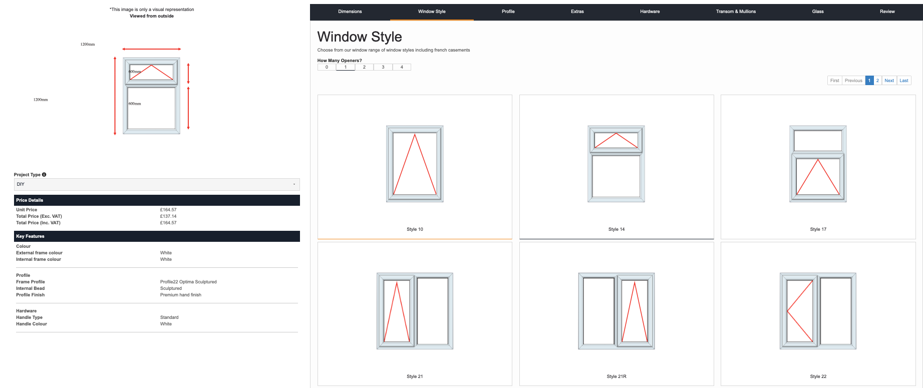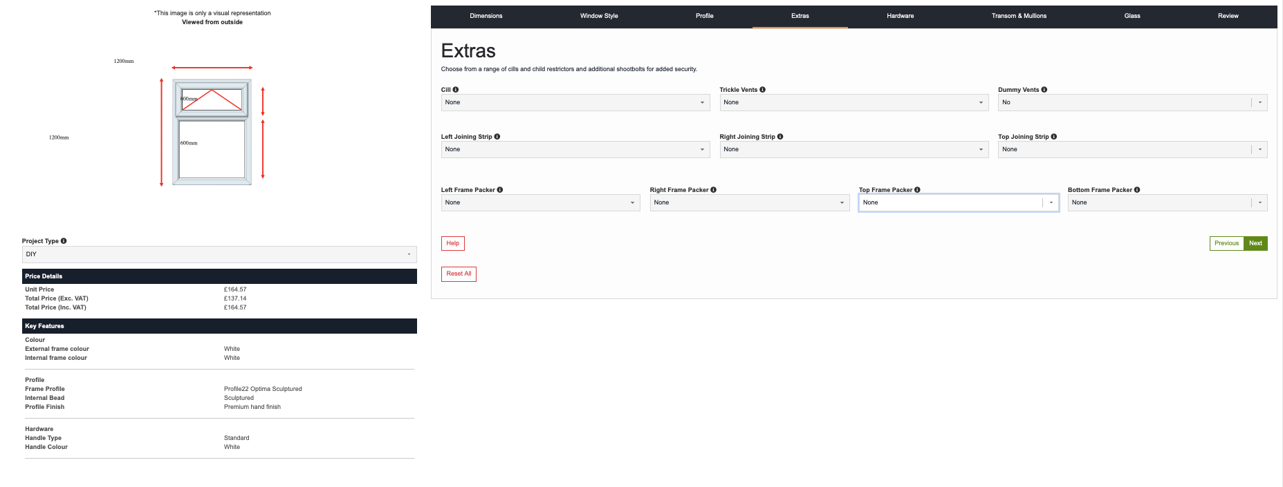In the Windows Style section you select your preferred window style and openings. Using the sliders under each section you can explore the full range of options available within your size limitations. When you select one of the windows, it will appear in the left hand panel, with the costs and key features - this will change as and when you add certain options. You also have the ability to view all styles within the sections. If we haven't offered the style of product you want on the designer, you can download a measuring sheet for the product, draw the design you are looking for in as much details as possible and then upload you file. This will notify the team who will get in touch as soon as possible with a price. Once you have finished, then click the Green Next button.
