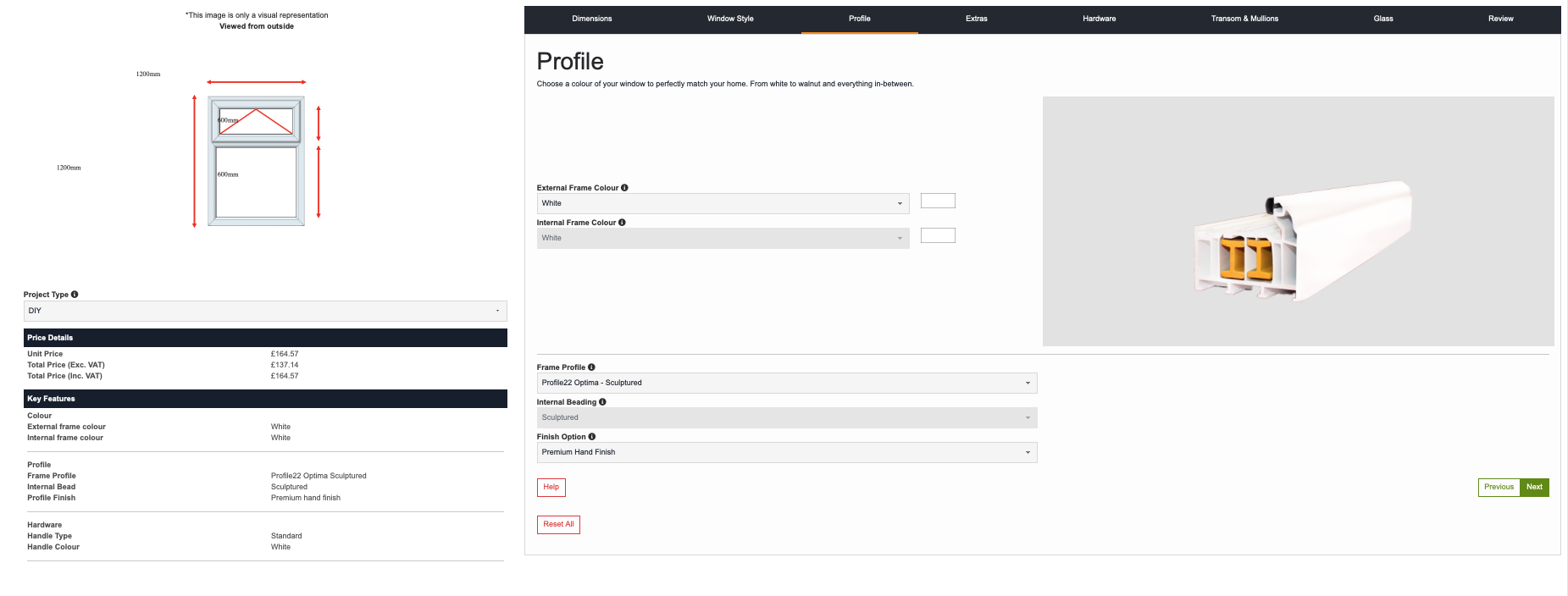 In the Profile selection you can now select the colour of your windows to perfectly match your home. We carry an extensive range of colours and can also bespoke match a specific colour too. You will need to select the external and internal colours. You will also need to choose the profile shape - either sculptured or chamfered. The image will change so you can see what you have selected. Once you have finished, then click the Green Next button.