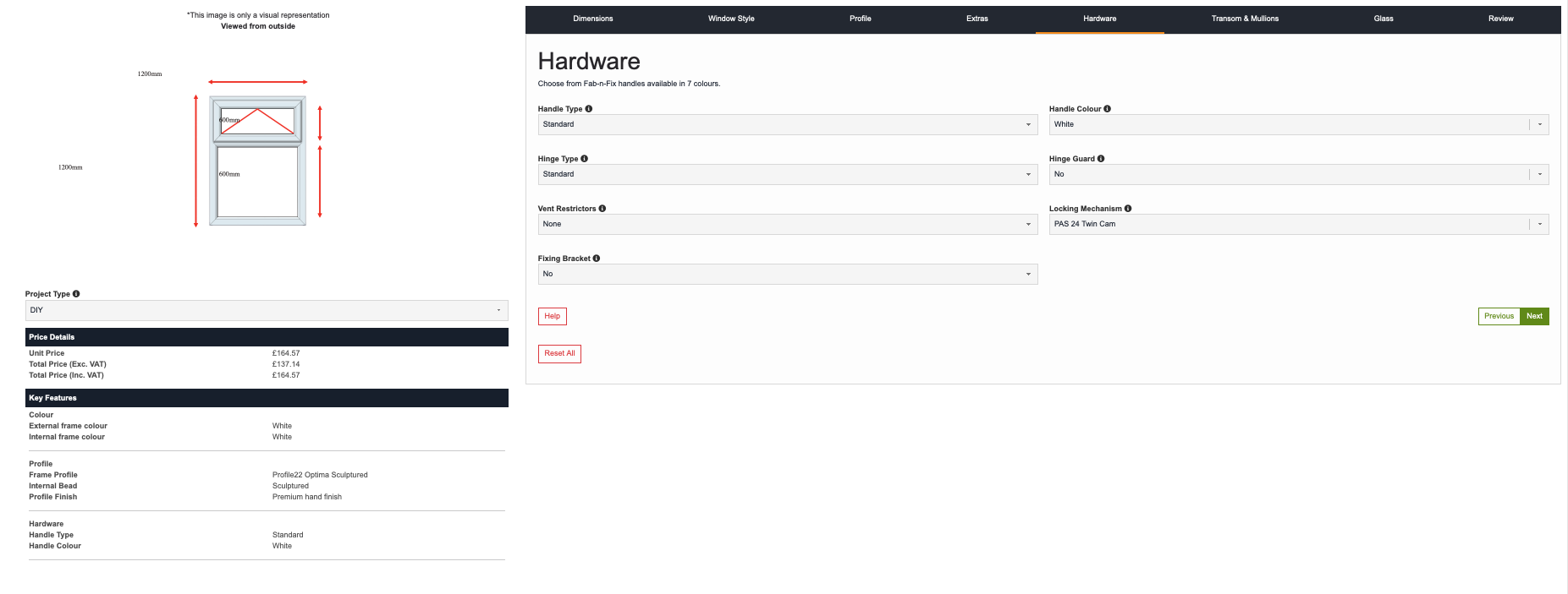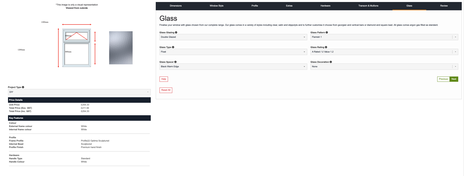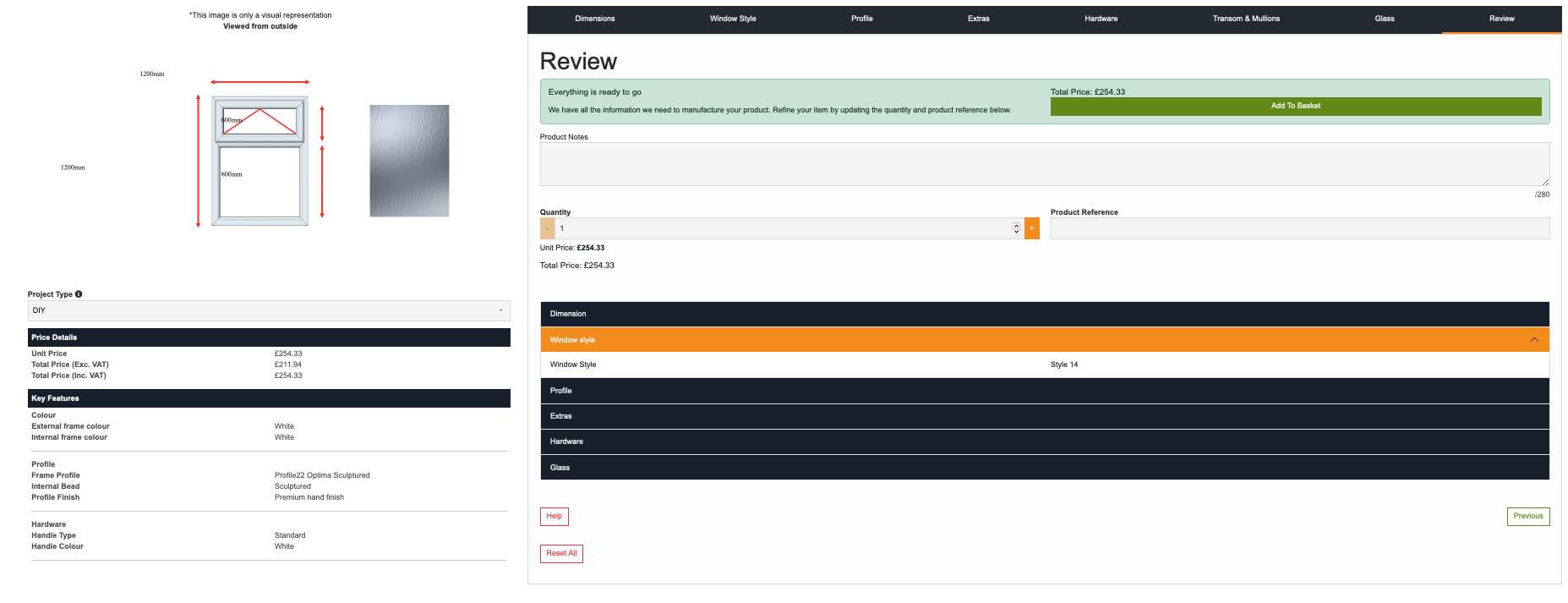 The final stage is the review section - here you will run through the final design and specification before you add the window to your basket before purchasing. If you need to change anything, now is the stage to do it. You can use the tabs across the top to get back to the relevant section, once you have made the changes it then updates the review section. If everything is correct click the add to basket, then either start the design of another window, or go to the checkout to purchase the window you have just designed.